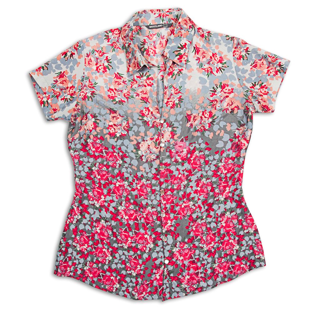 Блузка полуприлегающего силуэта. Застежка центральная на навесные петли и пуговицы. Рукава короткие. Воротник отложной.